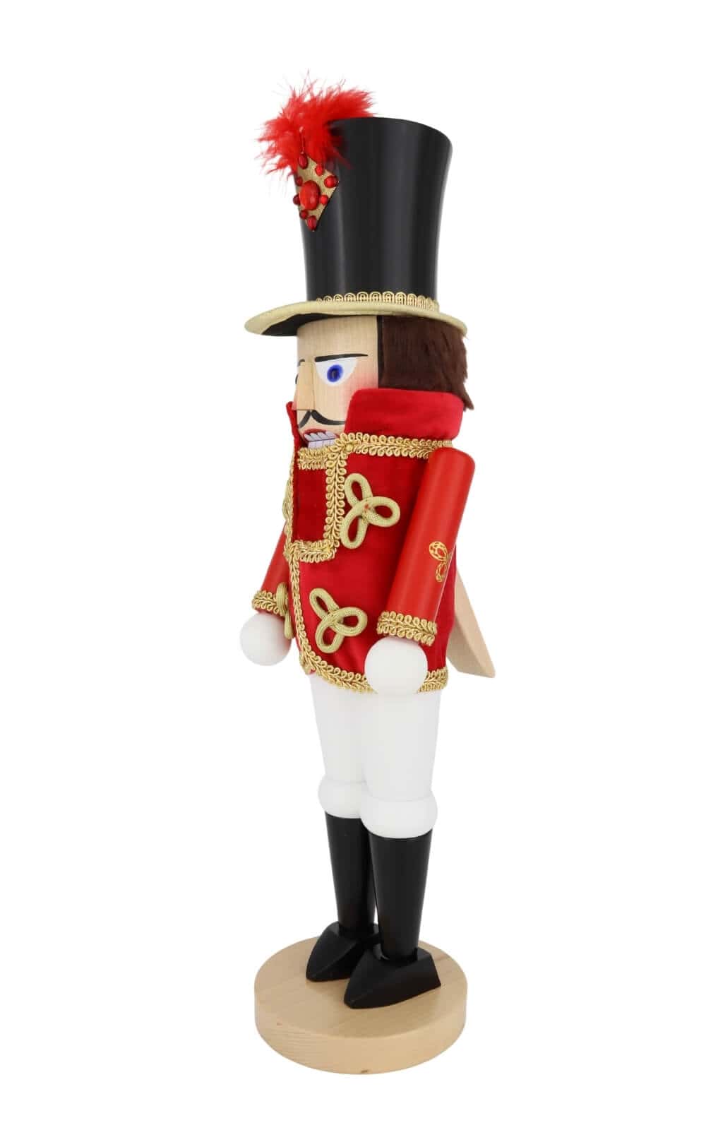 The nutcracker impresses with its unusual design and colorful details. With a height of 40 cm/15.7 in, a width and length of 14 cm/5.5 in each, he is a real eye - catcher in every Christmas decoration and Advent. Especially striking is the red royal uniform with gold decorations. Even the hat is emblazoned with the red feather and glittering stones.