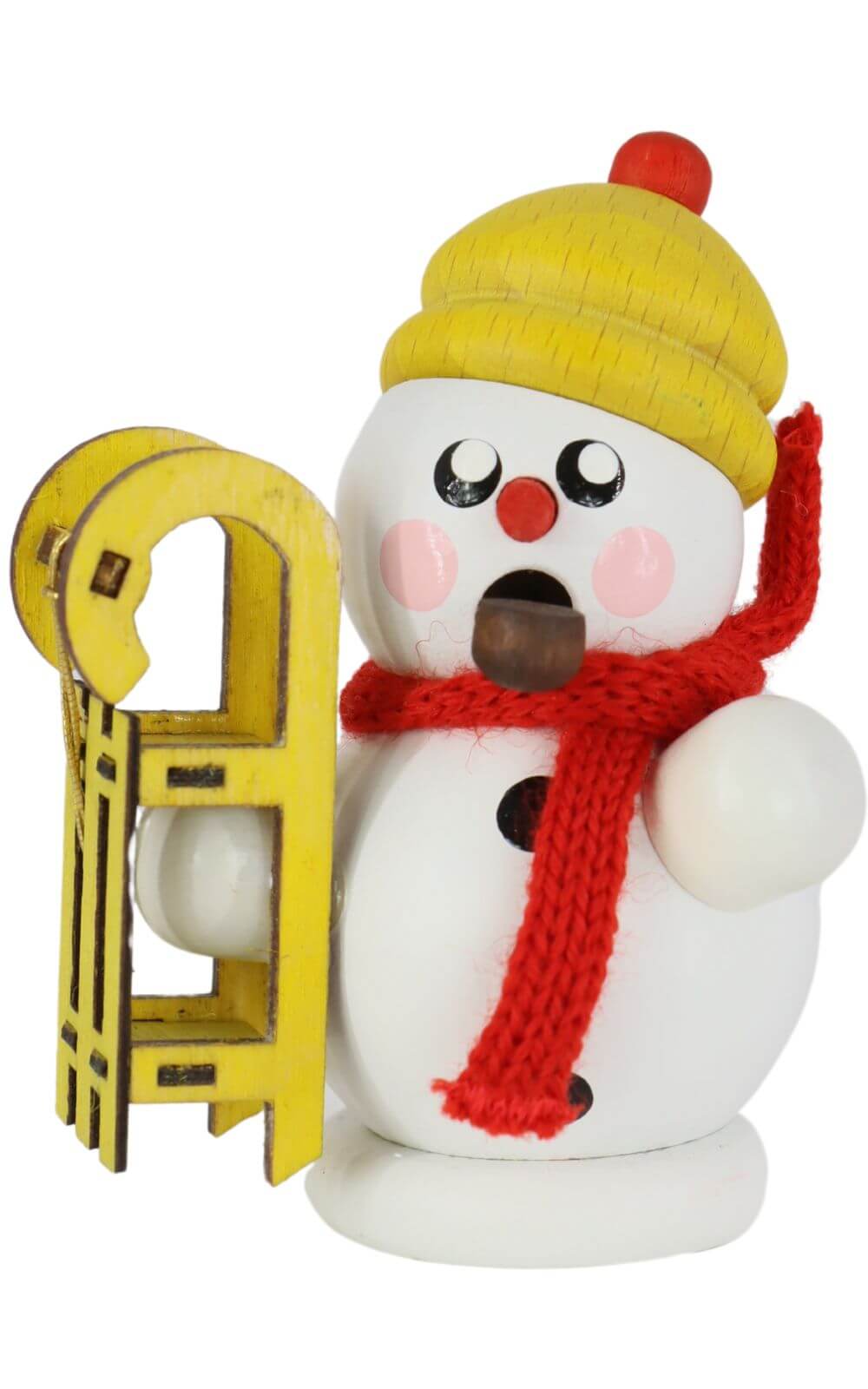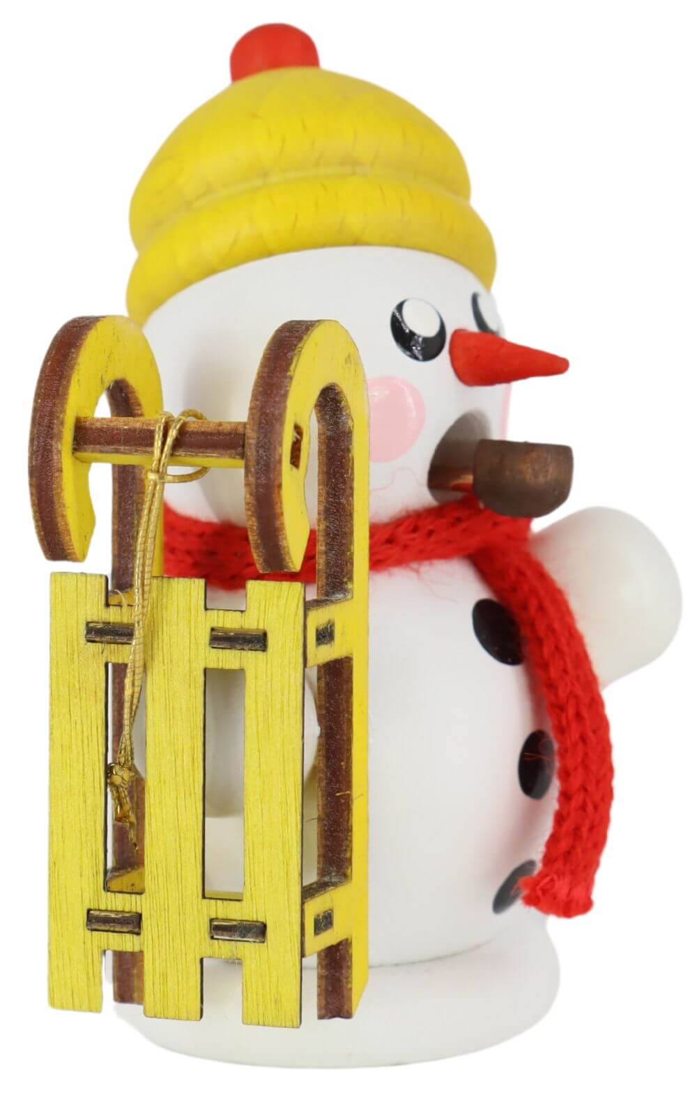 The Smoker Figurine Snowman with Sled, white by Gerd Hofmann captures the essence of winter fun and festive spirit. The snowman, with its white wooden body, yellow hat, and bright red scarf, is holding a handcrafted sled in warm yellow and brown tones. His red carrot nose, rosy cheeks, and painted buttons bring this figure to life and make it an endearing highlight for any holiday setting.