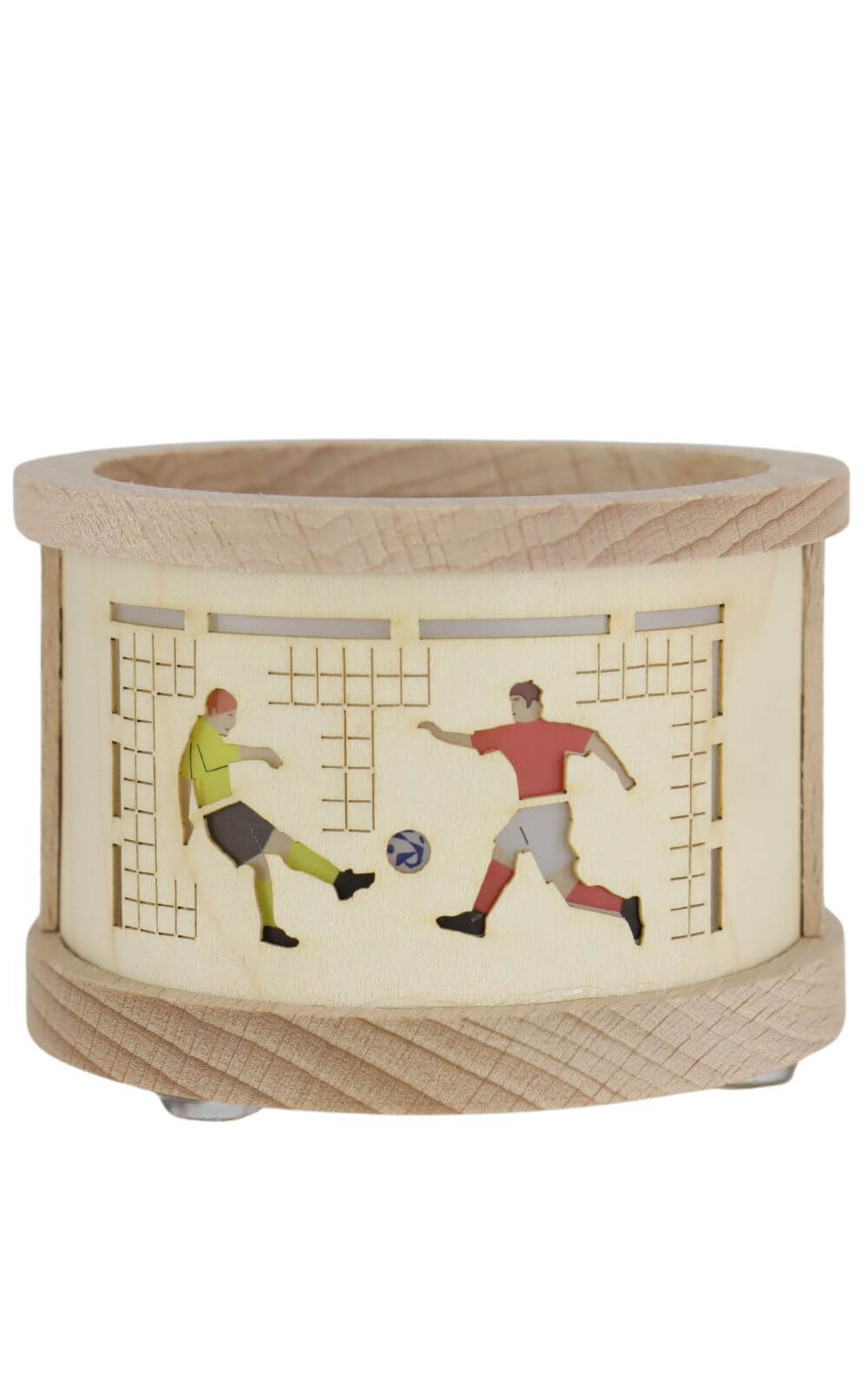 The tea light lantern with soccer is manufactured by Richard Glässer GmbH in the spa town of Seiffen in the Ore Mountains. Richard Glässer stands for the highest quality and excellent craftsmanship. Each lantern is made from local woods such as maple, beech, alder, ash, spruce, lime and pine, which reflects the high level of craftsmanship and attention to detail. This lantern is a symbol of the region's traditional craftsmanship.